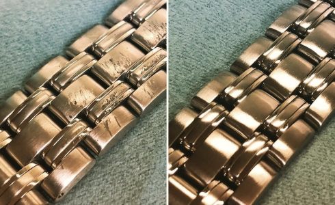 外装仕上げ(キズ取り研磨)の作業前後の比較です。ケースとブレスレットの輝きが戻りました。